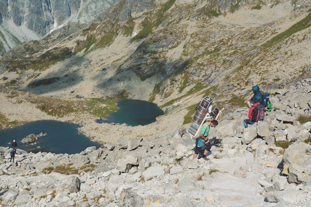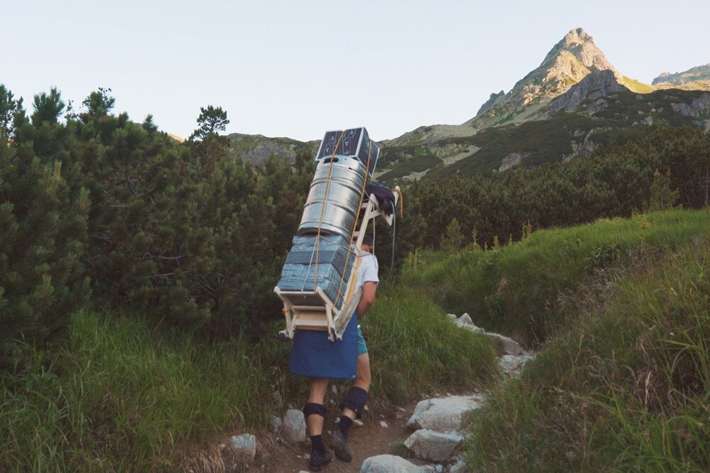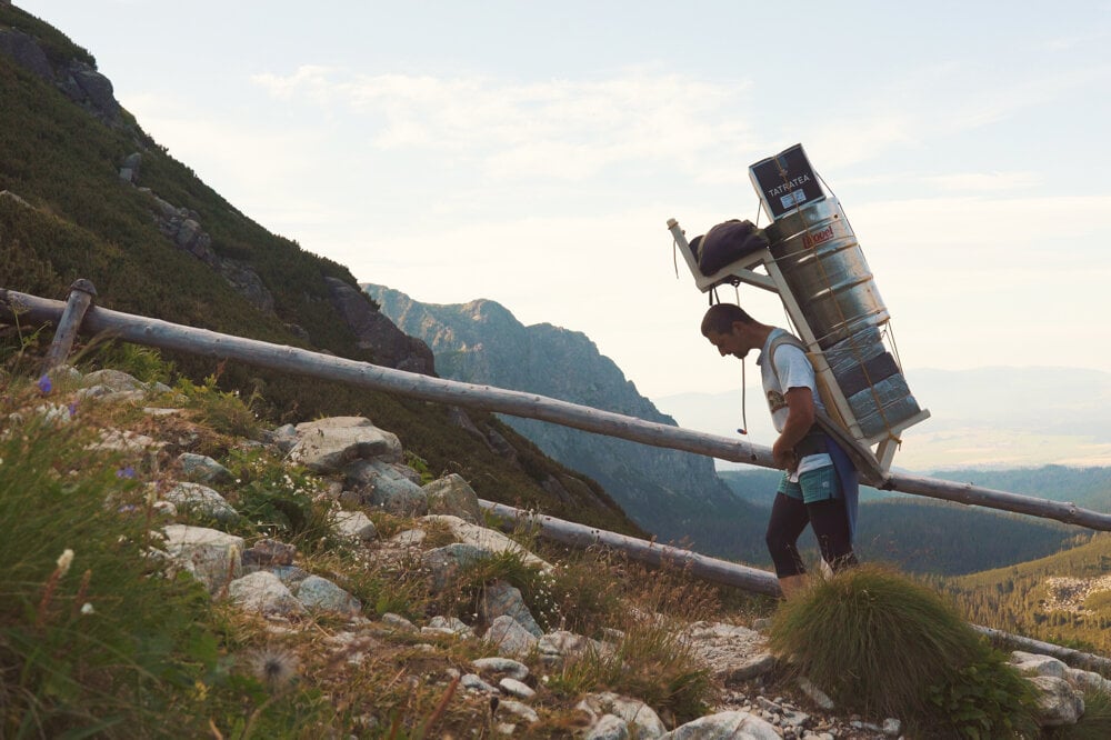 Horskí nosiči by sa mali čo najviac ponáhľať, pretože na Chate pod Rysmi ich čakajú dve 16-hodinové zmeny. Varia, upratujú, balia i obsluhujú. Vlado, ako mu na horách hovoria, má pred sebou štyri hodiny šliapania, z Popradského plesa totiž vyrazil len pred malou chvíľou.
